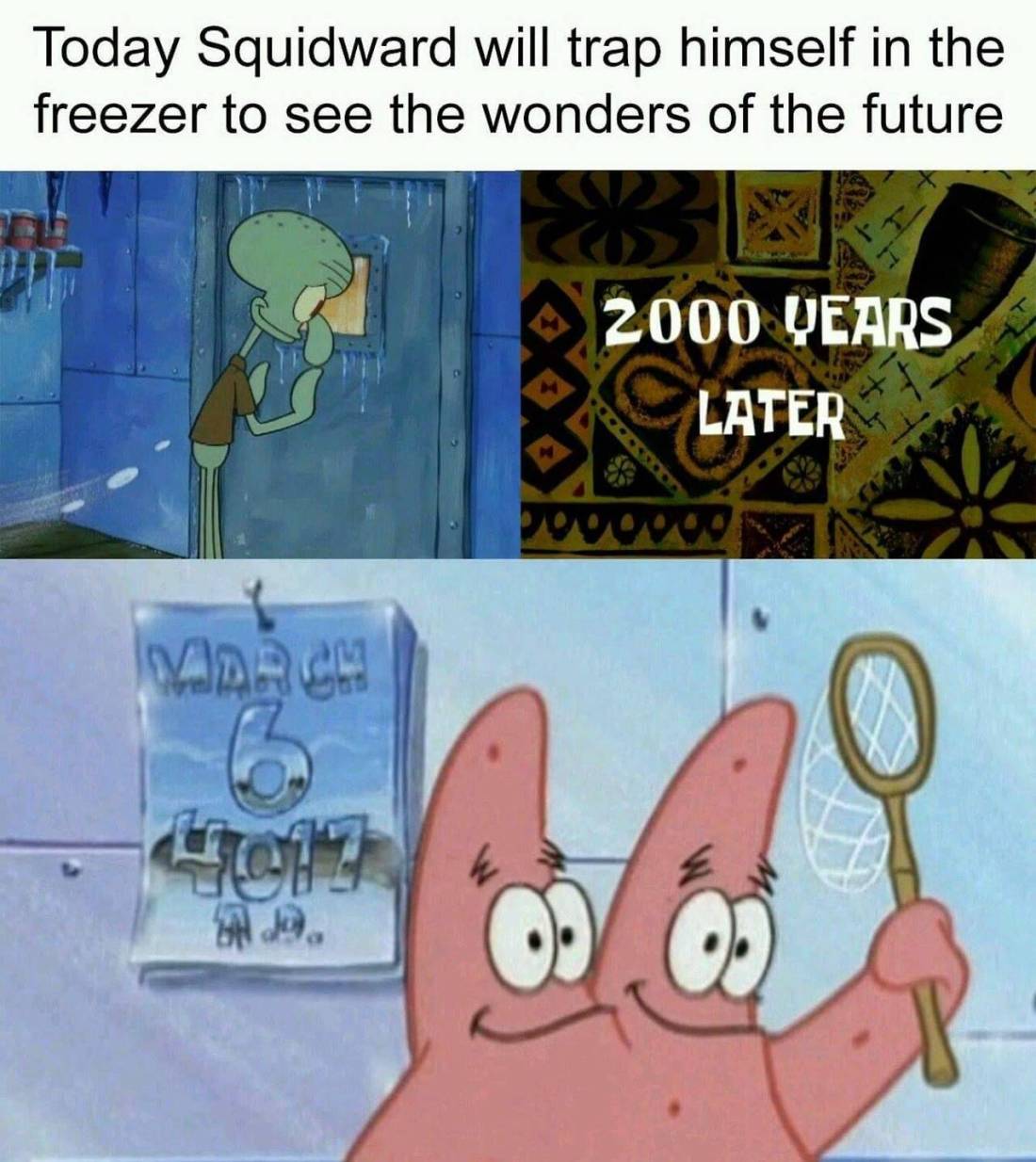 Today is the only day you can share this meme. Precisely 2000 years prior to March 6th 4017. The day Squidward trapped himself in the freezer. March 6th 2017.